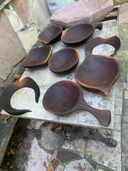 Majd a turnékra vittem a régi szerszámokat, vésőket, s kerestem a különböző fákat. Jöttek a tálak is sorban. Komoly beavatást én is Nagy Kristóftól kaptam, mint sokan mások, akiket kinevelt, s az első igazi kapacsot, favájó eszközt. Kivájtam vele rögtön egy fotelt fekete dióból.